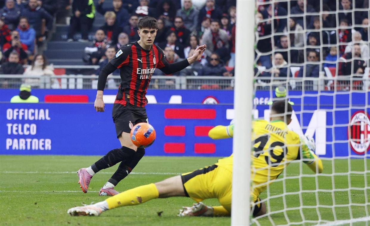 好在队里还有个能指望的人。 葡萄牙边锋拉斐尔·莱奥,这小伙子的天赋肉眼可见。 第64分钟,中场小将亚沙里从后场送出一脚精准的长传,像装了GPS一样找到前插的莱奥。 莱奥抬头一看,科莫门将布特兹站位有点靠前,他几乎没做调整,在禁区外轻盈地起脚,皮球划出一道美妙的弧线,越过门将头顶,坠入网窝。 1-1! 这个进球,漂亮是漂亮,但也透着一股子无奈,球队打不开局面的时候,还得靠球星的个人能力灵光一现来救命。